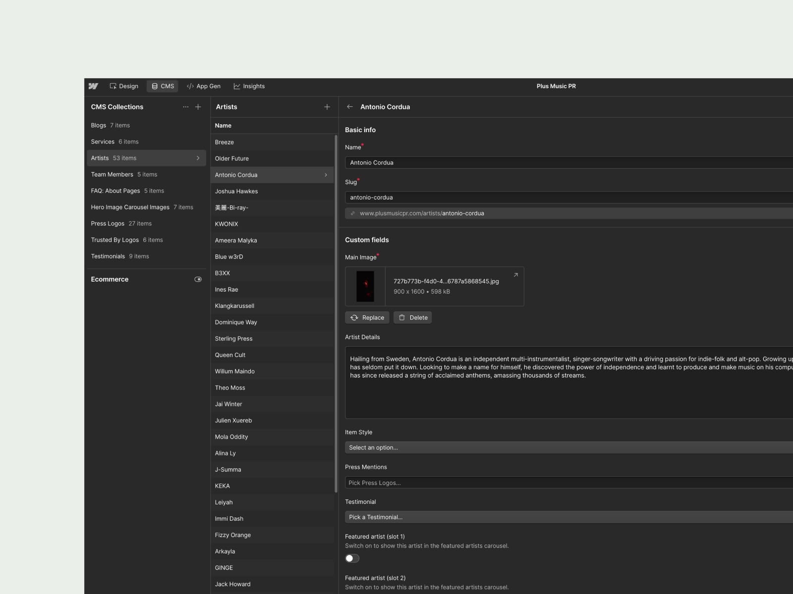 Lewis and the Plus Music PR team had been through it with a previous Webflow developer and wanted something a little more advanced and impressive. They have a growing roster of artists that is well worth showcasing to the world. In turn, they hoped this would drive more artists to sign up for their services.