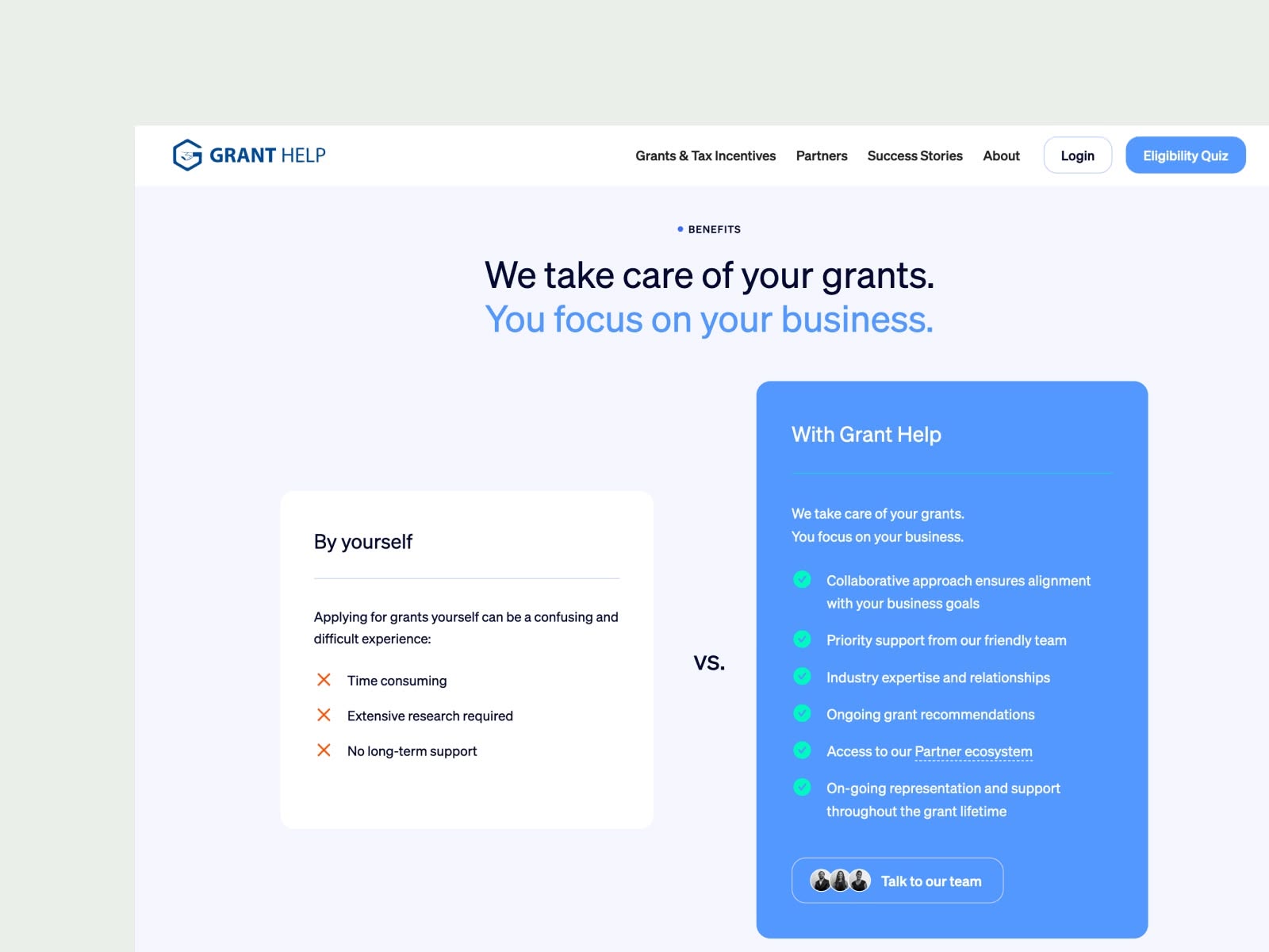 We used the full extent of Webflow's native capabilities to build a unique website that positioned Grant Help as industry leaders.